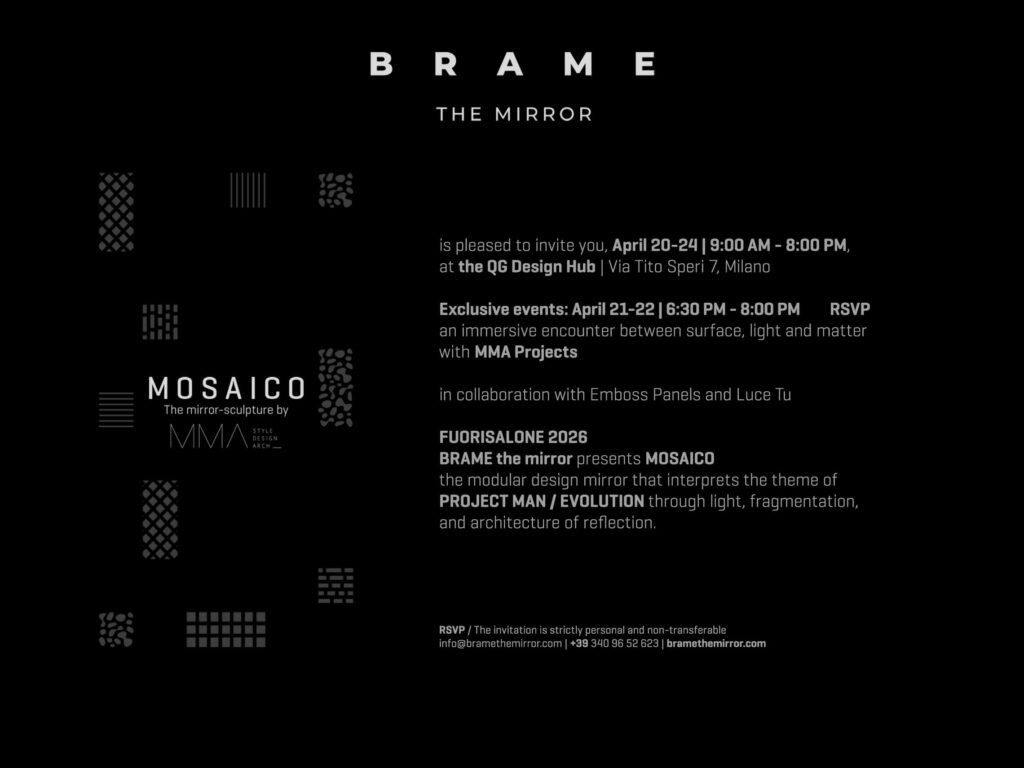 Milano, aprile 2026 – In occasione della Milano Design Week 2026, Emboss Panels presenta al QG Design Hub di Milano (via Tito Speri 7) un’installazione site-specific di BRAME the Mirror firmata MMA Projects, che esplora il tema “Progetto Uomo – Evoluzione” attraverso un dialogo materico tra superfici tridimensionali, luce e riflesso.